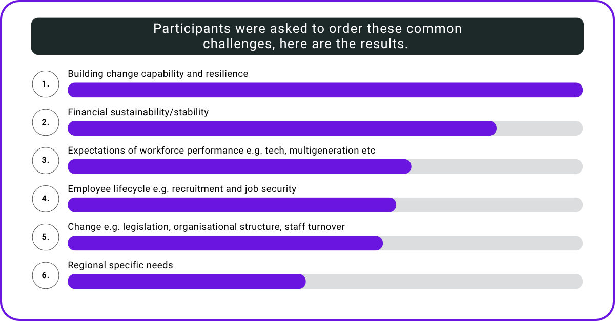 The morning was highly interactive, with participants collaborating on the challenges emerging across the region. Once the most common challenges were identified the network was asked to identify which they most connected with, here are the results.
